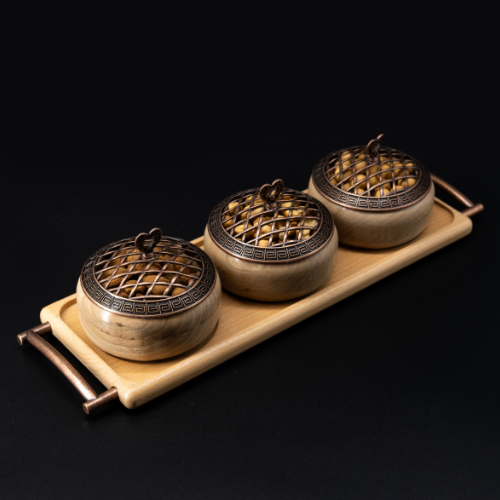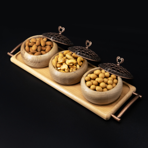 Doğanın sıcaklığını yansıtan doğal ahşap kaseler ile modern ve şık çizgiler taşıyan antik eskitme metal kapaklar, her sunumunuzu bir sanata dönüştürüyor.